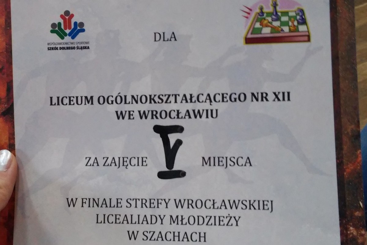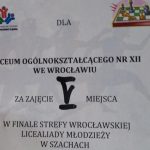 I mamy kolejny sukces, tym razem w szachach. W Licealiadzie nasz zespół zajął V miejsce na poziomie strefy wrocławskiej. Drużyny wg zasad, jakie obowiązują w tej rywalizacji, muszą mieć w składzie jedną dziewczynę. Grę prowadzi się jednocześnie na czterech szachownicach. Najlepiej wypadli Małgorzata Kowalik, zajmując indywidualnie IV miejsce na czwartej szachownicy i Krzysztof Lachowicz – III miejsce na pierwszej szachownicy. Wszystkim gratulujemy i życzymy powodzenia w przyszłym roku.