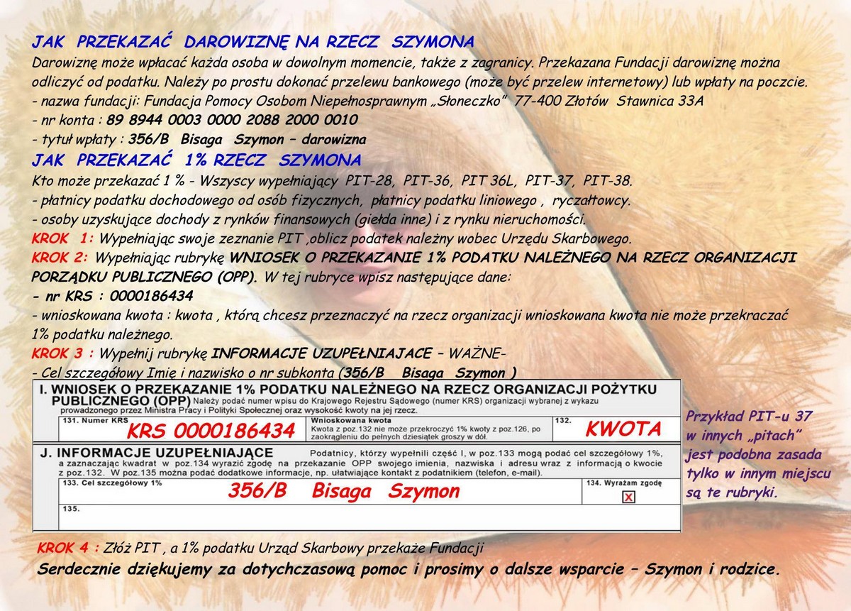 89 8944 0003 0000 2088 2000 0010, tytuł wpłaty: 356/B Bisaga Szymon – darowizna.