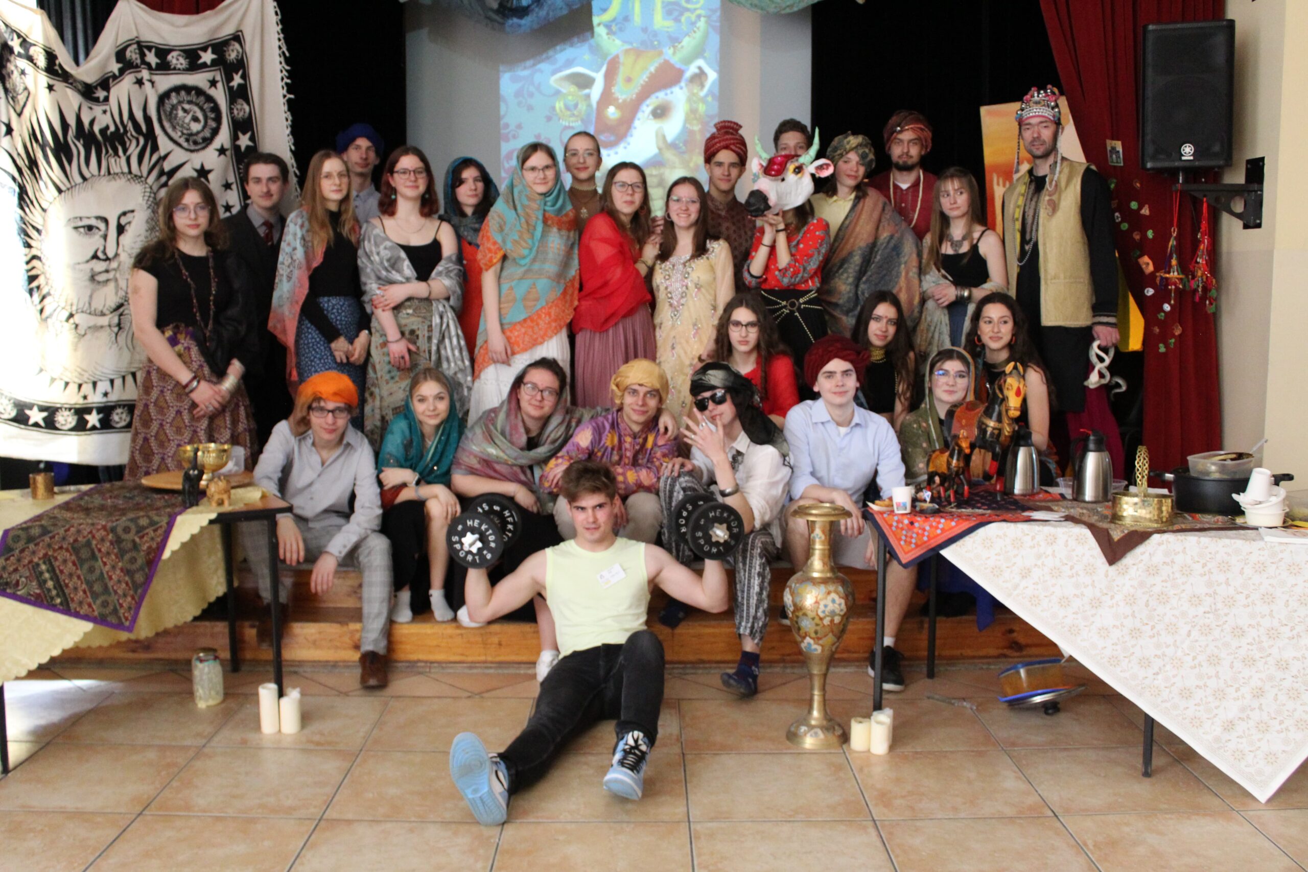 Klasa 3A-4 przebrana w białe koszule i kraciaste kilty przygotowała dla nas kilka słynnych szkockich potraw, do których zaliczały się m.in. batoniki Mars zapiekane w cieście czy (oczywiście bezalkoholowe) whiskey, przedstawiła tradycyjny taniec oraz zaproponowała udział w quizie wiedzy o Szkocji. Z kolei uczniowie klasy 3B-4, odznaczający się bardzo pozytywną energią, barwnymi strojami (nieodłącznie z kapeluszami z dużym rondem i grzechotkami) oraz równie kolorowym makijażem, postanowili przybliżyć nam nieco z kultury i kuchni Meksyku. Na ich stanowisku mogliśmy spróbować przykładowo nachosów z ostrą salsą, churrosów, tortilli i drinków z parasolką. Zdecydowanie warta uwagi była także możliwość sprawienia sobie wąsów w punkcie malowania twarzy albo sposobność wizyty u szamana. Klasa 3C-4 zaoferowała nam niebanalne stanowisko otoczone lasem choinek i biało-czerwone od kanadyjskich flag, gdzie mogliśmy spróbować m.in. naleśników polanych syropem klonowym, jak również przypatrzeć się najprawdziwszym kanadyjskim hokeistom! W zupełnie innym klimacie zaprezentowała się natomiast klasa 3D-4, która zabrała nas w podróż do Italii — poczęstowała pizzą, Panna Cottą i tiramisu, a do tego pokazała najsłynniejszych włoskich celebrytów. Dla odmiany na stoisku klasy 3E-4 przywitała nas czeska muzyka oraz czeskie flagi, a także cała gama słodyczy od naszych południowych sąsiadów, wśród których znalazła się słynna Czekolada Studentskà i Lentilky. Klasa 3F-4 zaprezentowała nam z kolei Francję wraz z całym bogactwem jej smaków, w tym najróżniejsze sery oraz nadziewane croissanty. Nie zabrakło tam także quizu wiedzy o Francji, a nawet chemicznych eksperymentów… Wreszcie, zwieńczeniem całego Dnia Języków Obcych okazały się Indie, które przedstawiła nam klasa 3G-4. Ich klimatyczne stoisko, wokół którego paliły się świece i unosił się zapach z kadzidła, oferowało m.in. wegetariańskie curry z ryżem, tikkę masalę, ravę laddu (kulki z kaszy manny) czy też rassgulę (kulki twarogowe). Całości dopełnił tradycyjny indyjski taniec zaprezentowany przez uczniów z tej klasy przebranych się w hinduskie szaty, turbany, chusty i biżuterię.