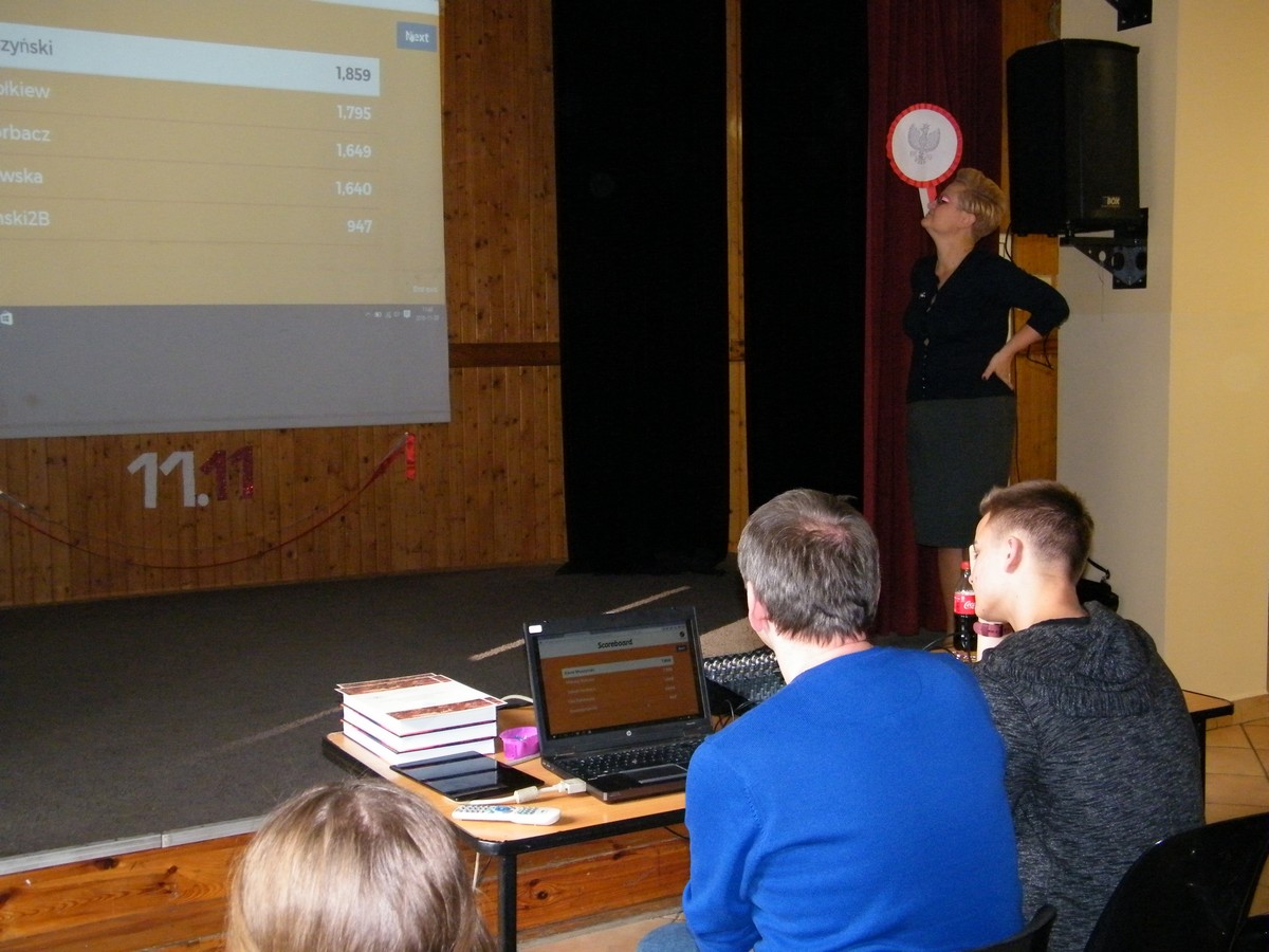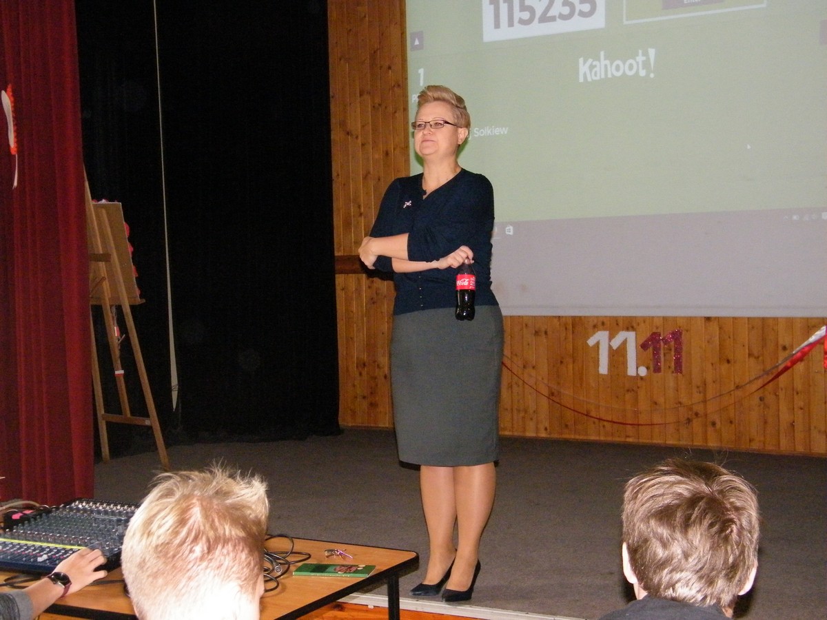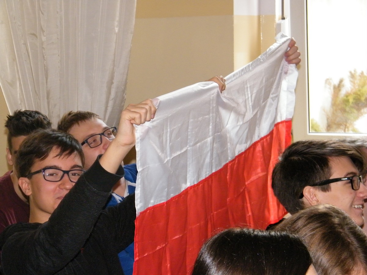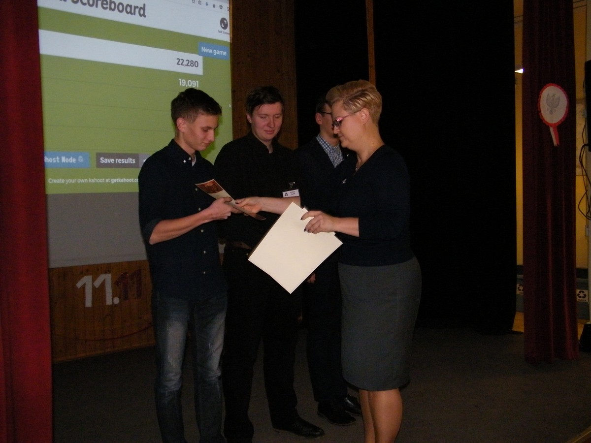 11 listopada to bardzo ważny dzień w historii Europy i Polski. Jak każdego roku, również i obecnie postanowiliśmy uczcić Święto Odzyskania prze Polskę Niepodległości i przybliżyć uczniom wydarzenia i ludzi, którzy umożliwili powstanie niepodległego państwa po 123 latach niewoli. Skierowaliśmy do uczniów naszej szkoły propozycję wzięcia udziału w szkolnym konkursie. Pomysłodawcą i autorem pytań był pan prof. Zdzisław Jaskólski. Konkurs był dwuetapowy. W pierwszym etapie zainteresowani uczniowie pisali test, drugi etap odbył się 9 listopada z wykorzystaniem platformy internetowej. Poza finalistami, w konkursie mogli brać udział również udział również uczniowie z sali, którzy zostali zaproszeni na finał. Najlepszym historykiem okazał się Karol Muszyński z klasy 2a, drugie miejsce zajął Łukasz Fedak z klasy 3d, a trzeci był Mikołaj Sołkiewicz z klasy 1d. Nagrodę dla publiczności zdobył Jan Chmielecki z klasy 2b. Fundatorem nagród była Pani Dyrektor dr Danuta Daszkiewicz-Ordyłowska.