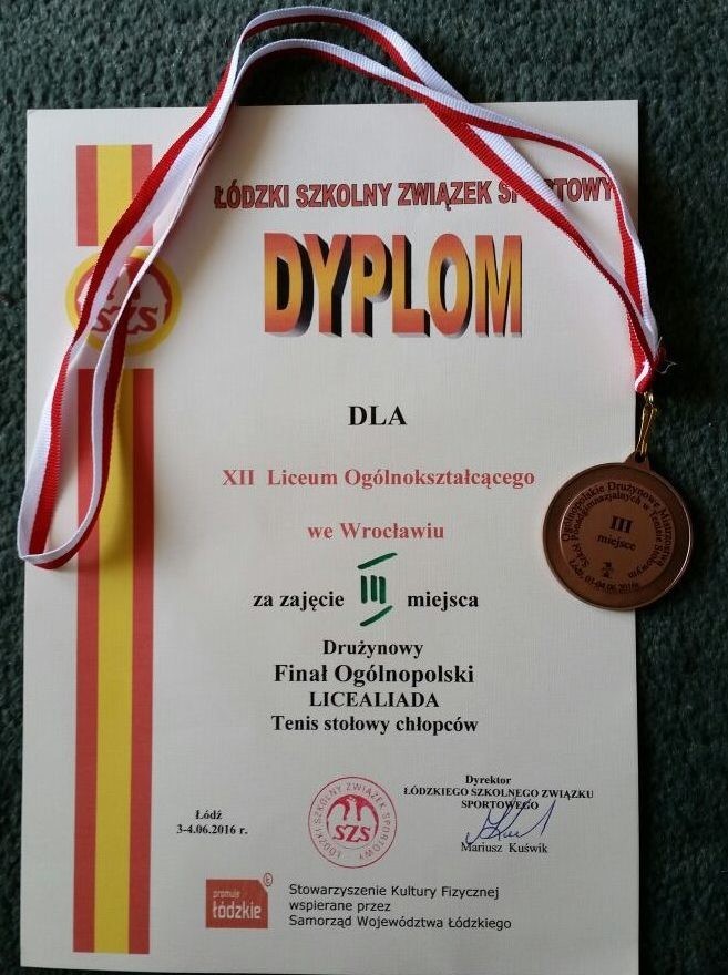 I mamy dalszy ciąg sukcesów w tenisie stołowym ale już na arenie Polski. Reprezentacja stoczyła walkę z najlepszymi tenisistami w Polsce w kategorii szkół ponadgimnazjalnych. Na Drużynowym Ogólnopolskim Finale Licealiady w Tenisie stołowym, który odbył się w dniach 3-4.06. 2016 r. w Łodzi chłopcy zajęli III miejsce, zdobywając brązowe medale. Jest to w tym roku szkolnym 2015/2016 największy sukces sportowy choć dla dwóch reprezentantów ostatni występ w barwach szkoły. Chłopcy dobrze się spisali. Dziękujemy za dobrą postawę i życzymy powodzenia w dalszej karierze. A przyczynili się do tego sukcesu następujący uczniowie: